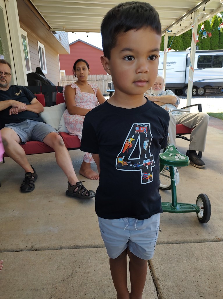 Lil Joseph, Didn’t need to ask the wise old owl in tree how many years old he was, he knew when he so proudly put on his 4 year old TSirt cupped his hands behind his back, Then he so happily posed and smiled for us to celebrate his special day. We have your back, Little Bisneto Joseph. Amor Great Grandma. Sherry.